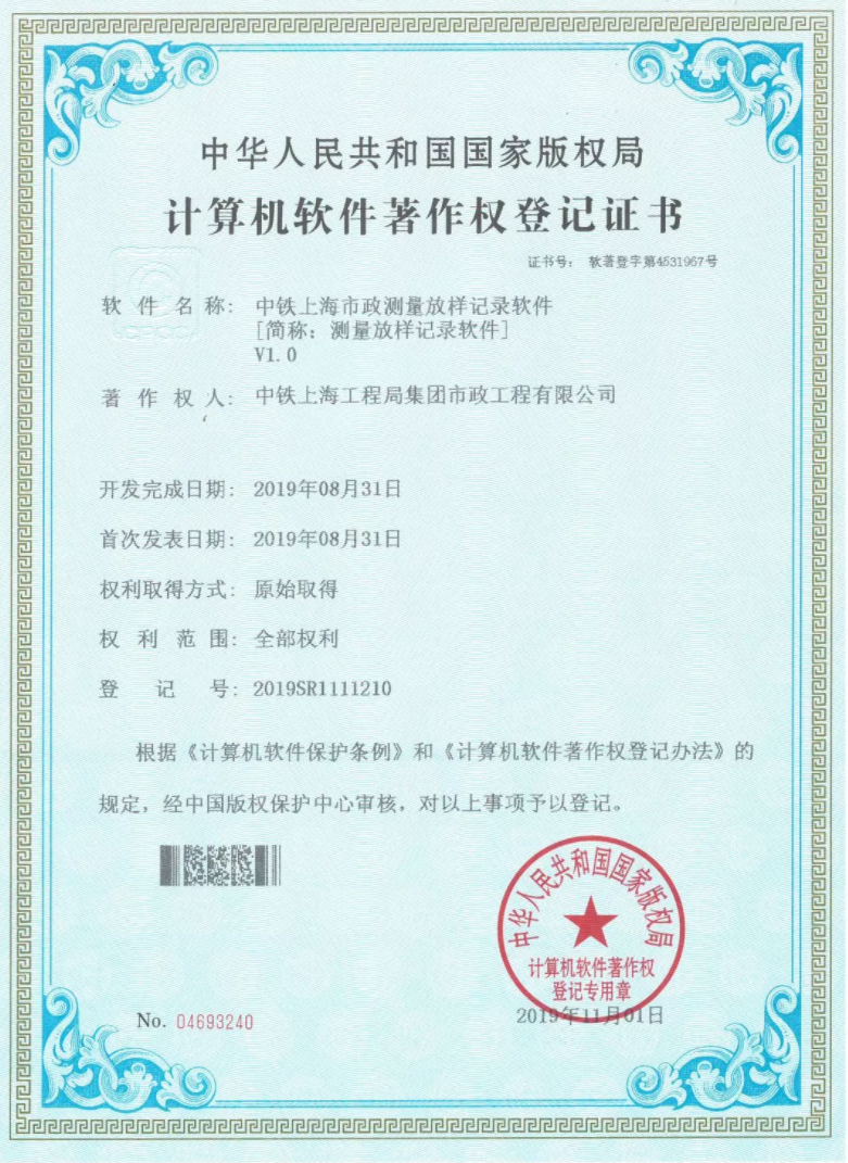 近日,從國家版權局傳來喜訊,公司技術創新工作又獲新突破!公司自主研發的“中鐵上海市政測量放樣記錄軟件”“中鐵上海市政基于ProStructures鋼筋計量軟件”通過中國版權保護中心審核,獲得國家版權局計算機軟件著作權授權,并取得了著作權登記證書。...