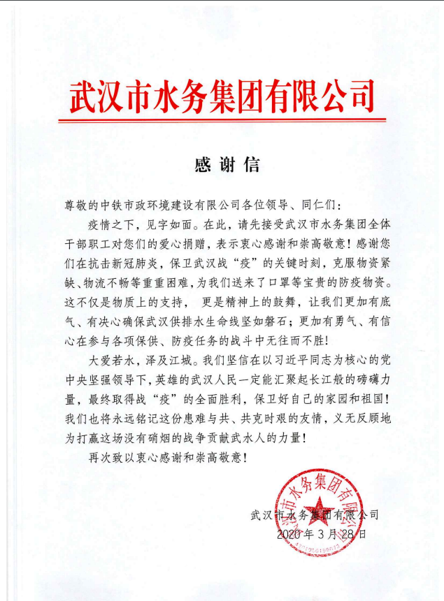 3月28日,公司承建的武漢黃家湖污水處理廠三期擴建工程在抗擊新冠肺炎,保衛武漢戰“疫”的關鍵時刻,克服物資緊缺、物流不暢等困難,向武漢市水務集團有限公司贈送口罩等防疫物資,與他們患難與共、共克時艱,做好疫情防控工作。為此,武漢市水務集團有限公司特致電表示感謝。...